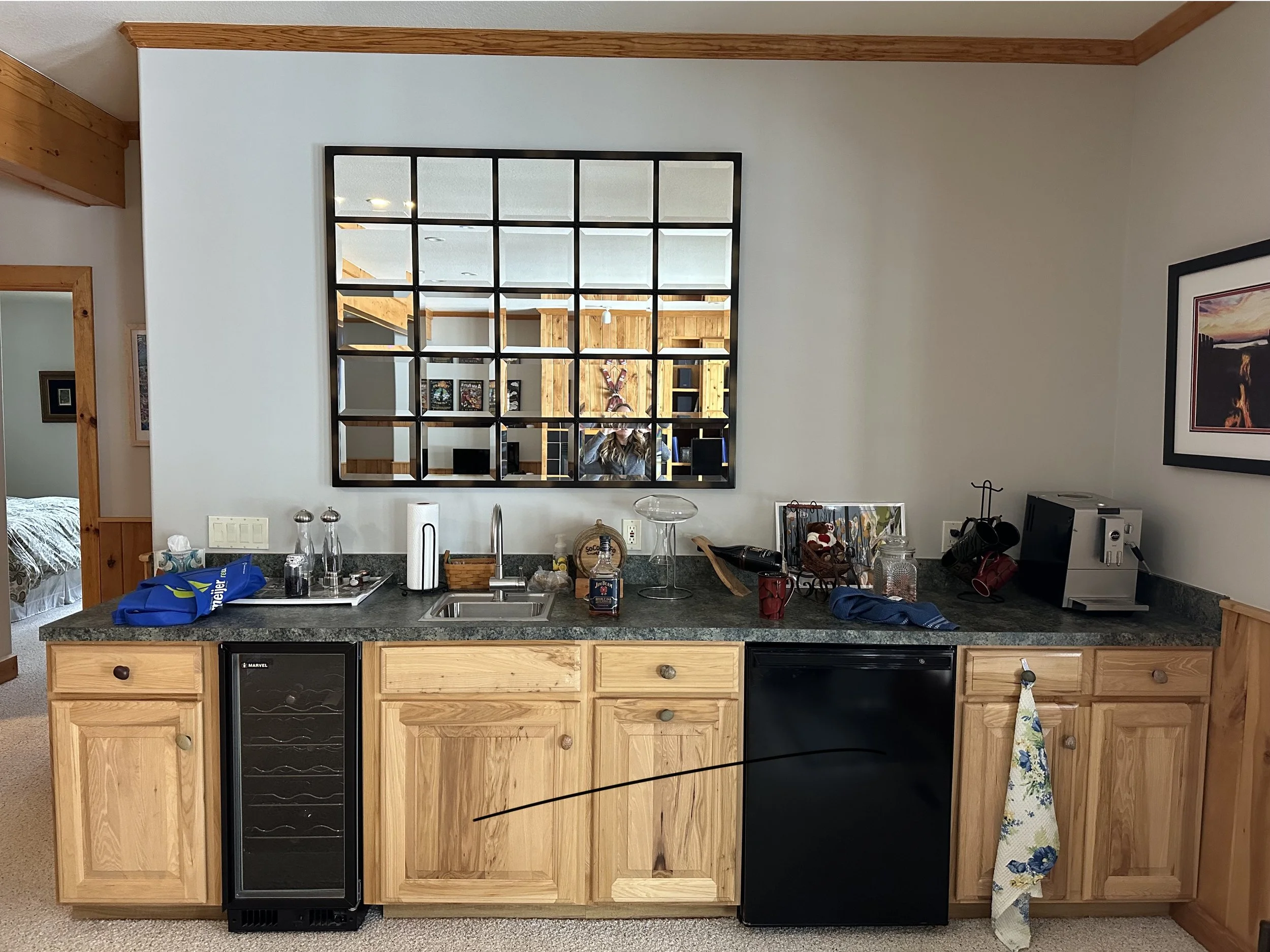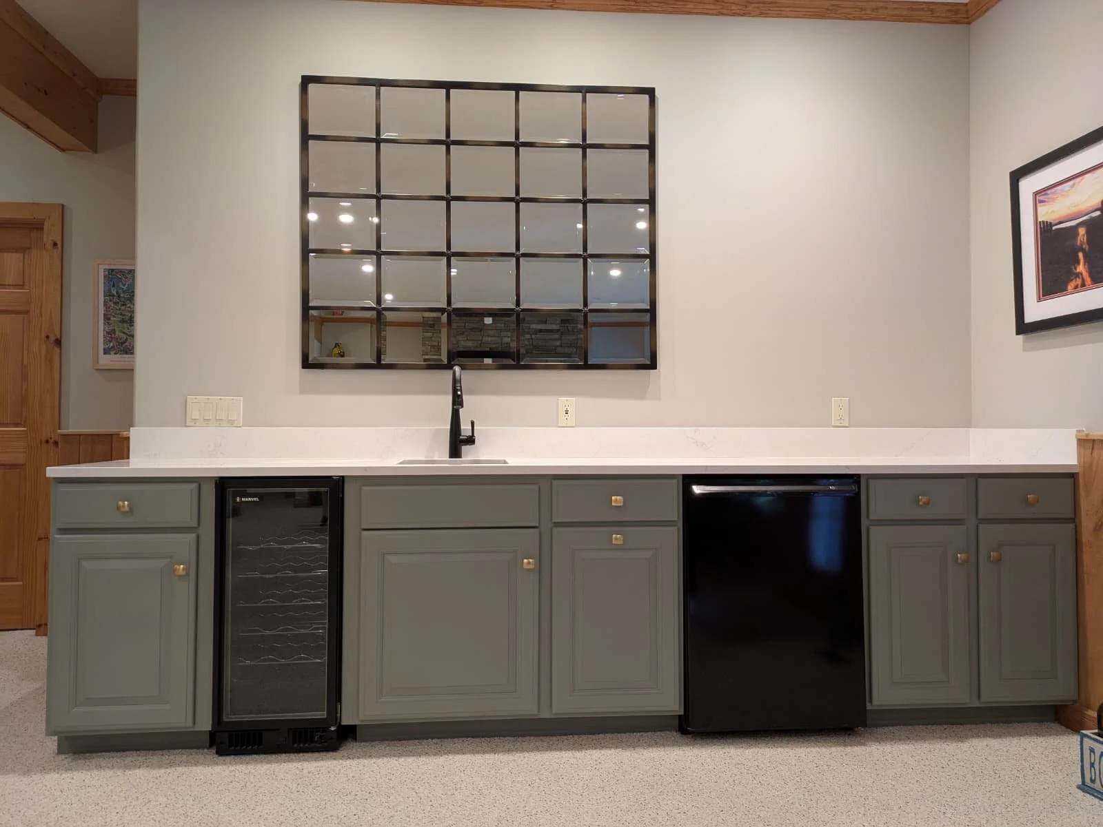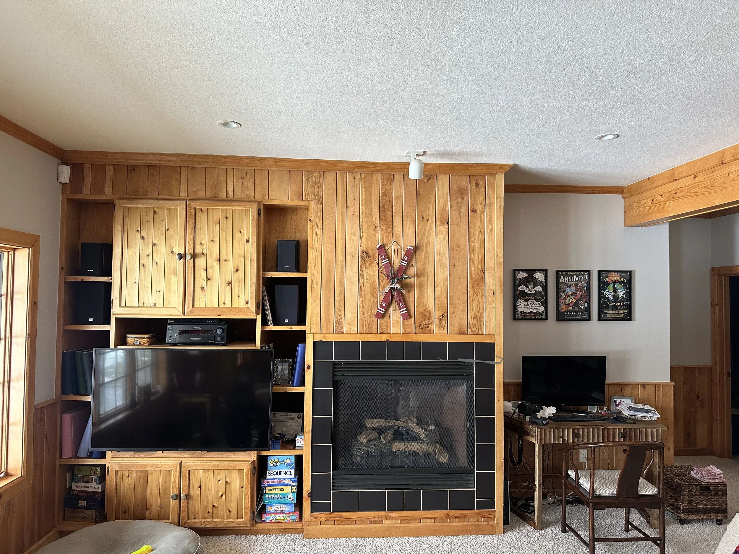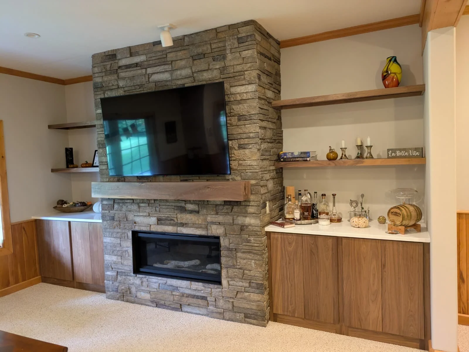Perched above a picturesque golf course in a northern Michigan ski town, this renovation transformed an outdated basement into a refined family retreat designed for entertaining. What began as a simple fireplace replacement evolved into a full-scale reimagining of the space, balancing high-end function with a sophisticated modern mountain aesthetic. Natural textures, such as the stone fireplace, and warm finishes in the natural-stained walnut cabinets and mantel bring depth and richness to the design. The result is an inviting space that embodies comfort, craftsmanship, and contemporary elegance.