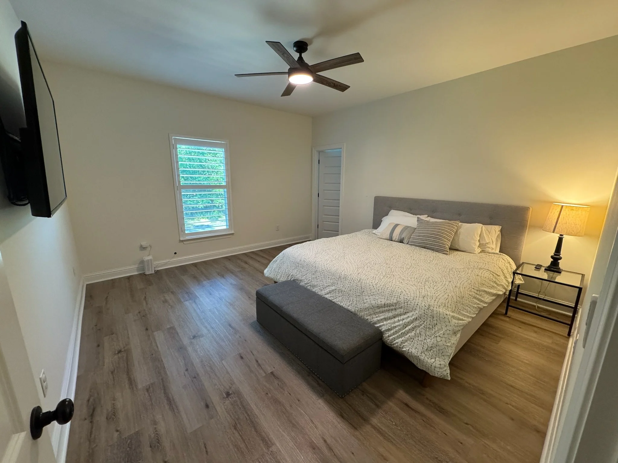 This bedroom transformation reimagines a standard space into a serene nursery designed to nurture a sense of safety and wonder. The goal was to create a calming environment where a new baby can feel secure to explore and thrive. Softly painted in Sherwin-Williams Coastal Plain, the walls set a tranquil tone complemented by a neutral area rug and warm wood accents. Subtle safari-inspired details add a touch of playful charm while maintaining a refined, timeless aesthetic. This space was thoughtfully designed to grow with the child, allowing the room to evolve seamlessly from nursery to toddler and beyond. With adaptable furnishings and a neutral, enduring palette, the design ensures lasting comfort and style through every stage of childhood.